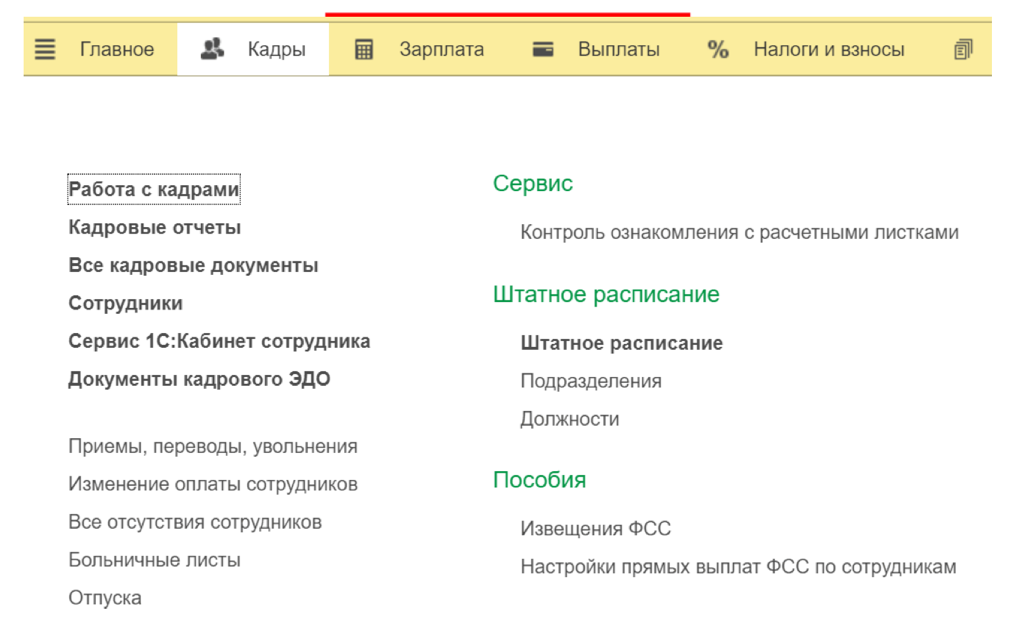 Рис.1. Раздел «Кадры» в программе «1С:ЗУП 3.1»