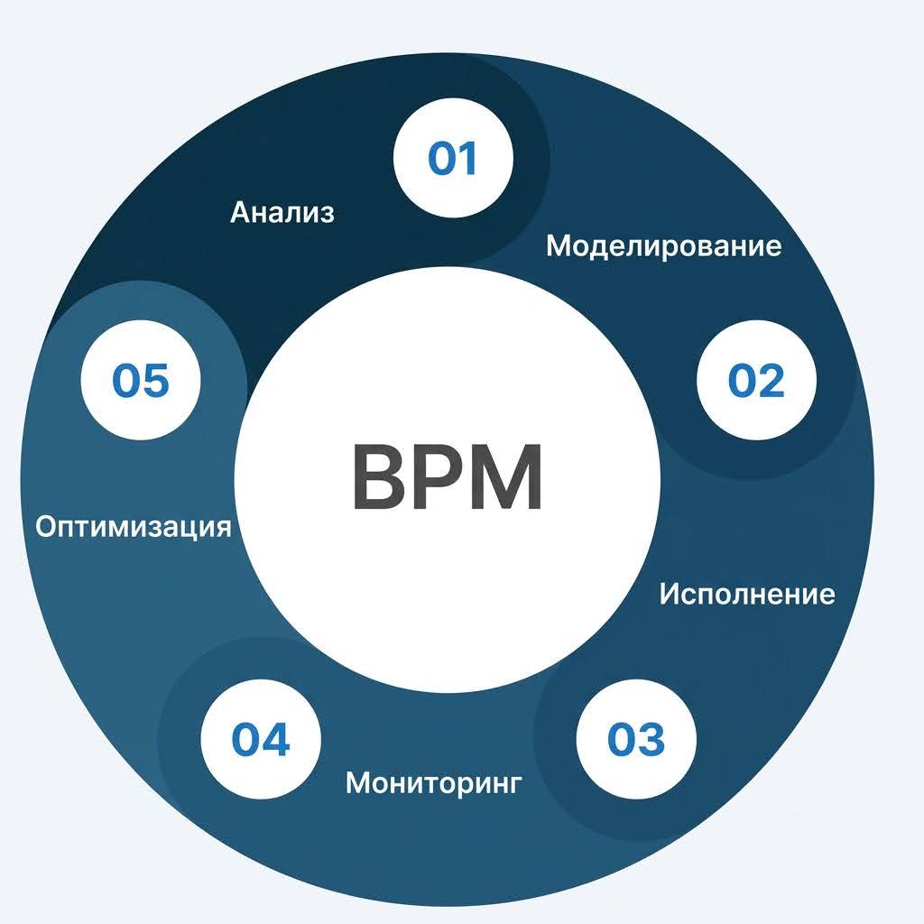 5 этапов BPM (цикл управления: анализ, моделирование, исполнение, мониторинг, оптимизация)