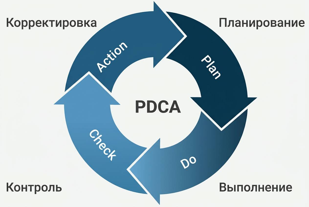 Для совершенствования процессов опытные управленцы используют цикл Деминга — PDCA (Plan-Do-Check-Act). Его сила в простоте и повторяемости. Вместо того чтобы пытаться сразу изменить все и навсегда (реинжиниринг), мы разбиваем большие перемены на маленькие шаги, каждую итерацию превращая в круг оборотов:
