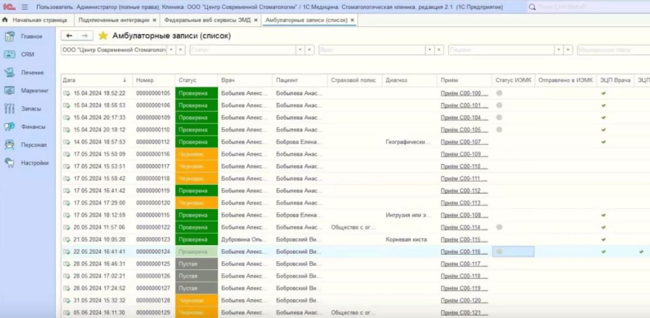 Рис.1. Перечень СЭМД со статусом передачи в программе «1С:Медицина.