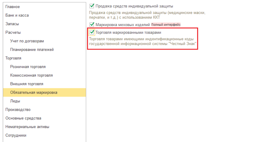 В разделе «Настройки – Функциональность – Обязательная маркировка – Торговля маркированными товарами» для учета маркированной продукции включите функцию «Торговля маркированными товарами» (рис.1.)