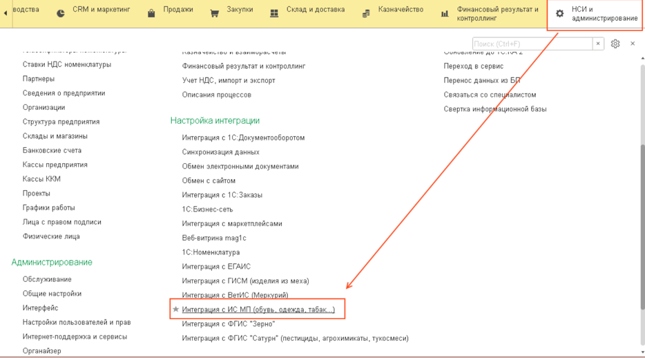 После включения функциональности в разделе «Администрирование» появится панель «Интеграция с ИС МП» (рис.2).