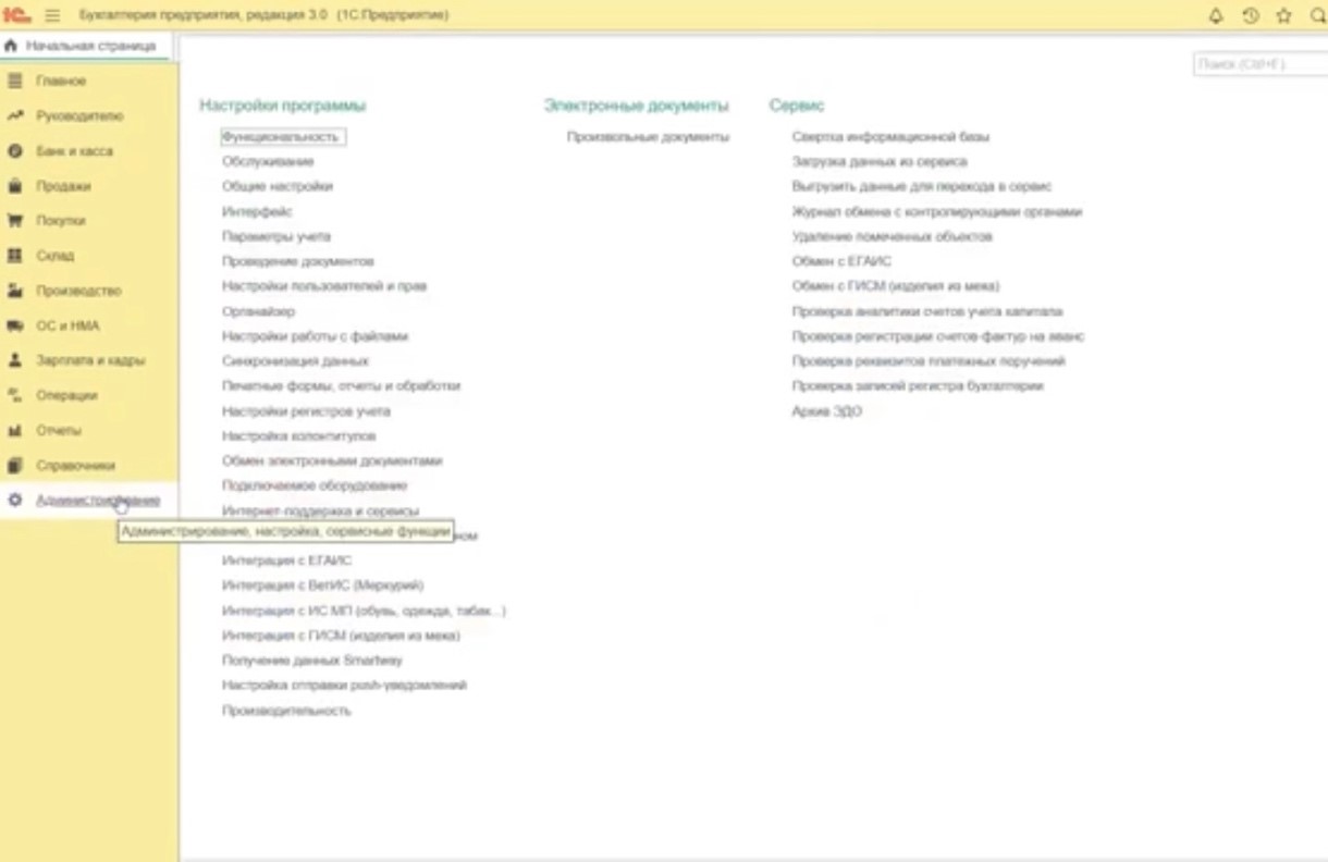 Шаг 1. В вашей «1С:БП» выберите нужную организацию, по которой необходим обмен данными. Затем в меню «Администрирование» – «Настройки программы» (рис.1) выберите раздел «Параметры учета».
