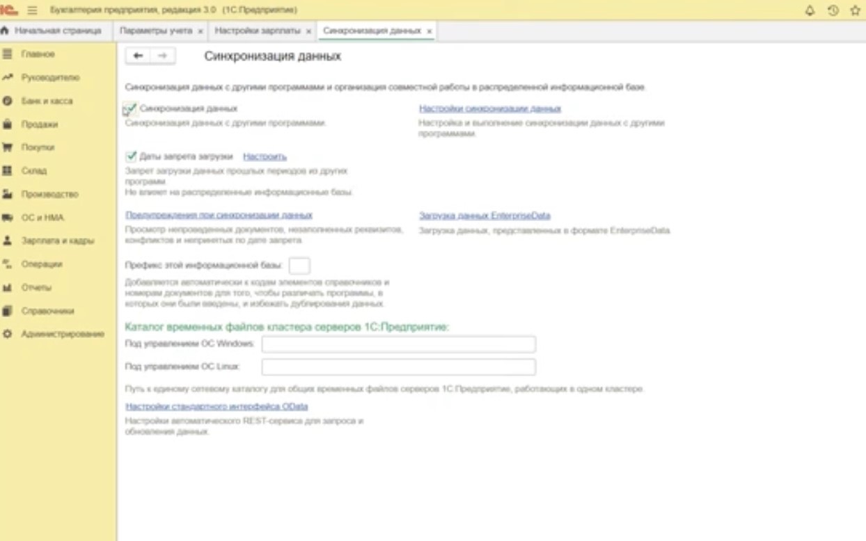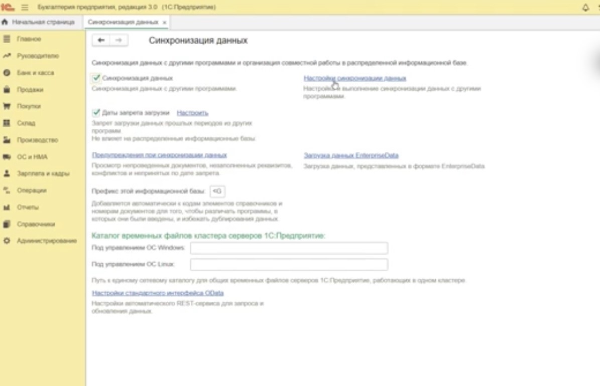 Шаг 2. Далее вам потребуется указать префиксы баз данных. Это необходимо, чтобы понять, в какой программе был создан документ. Для этого в программе «1С:Бухгалтерия» зайдите в раздел «Администрирование» – «Настройки программы» – «Синхронизация данных». В этом разделе поставьте галочки возле пункта «Синхронизация данных» (рис.3).
