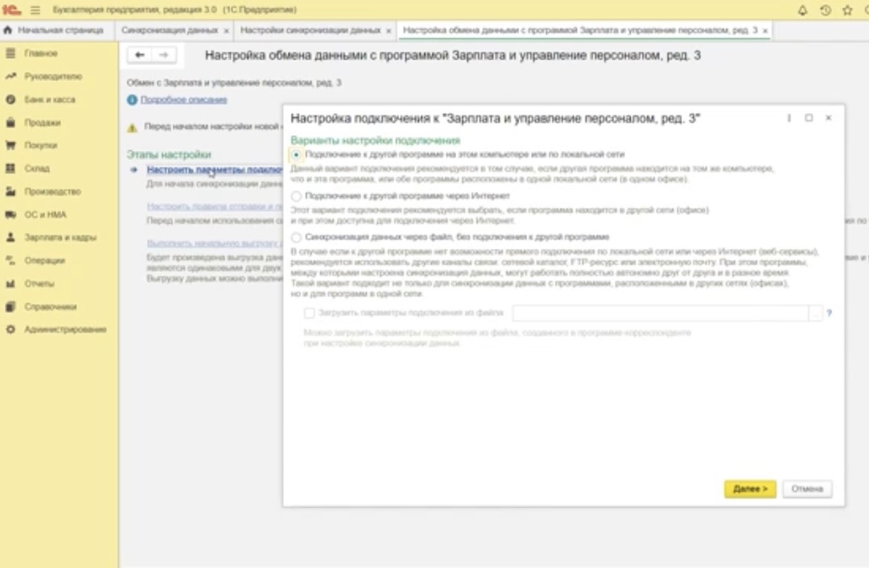 Если все данные введены корректно, вы увидите окно, в котором будет указано, что происходит настройка подключения к конфигурации «1С:Зарплата и управление персоналом». Проверьте в этом окне названия баз, префиксы и нажмите кнопку «Далее».