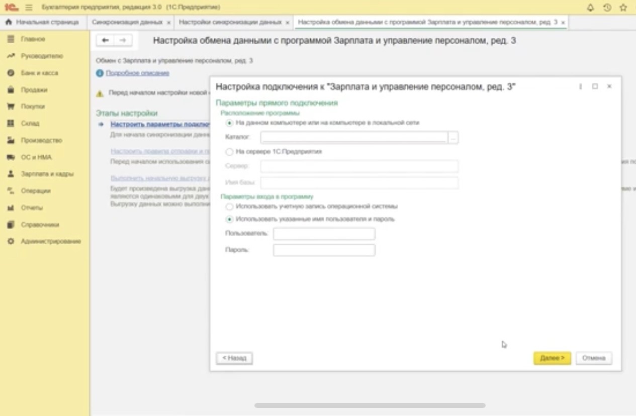 Укажите нужную информацию. Также заполните в этом окне параметры входа в программу – логин и пароль пользователя, который совершает обмен данными между «1С:ЗУП» и «1С:Бухгалтерией». Нажмите кнопку «Далее».