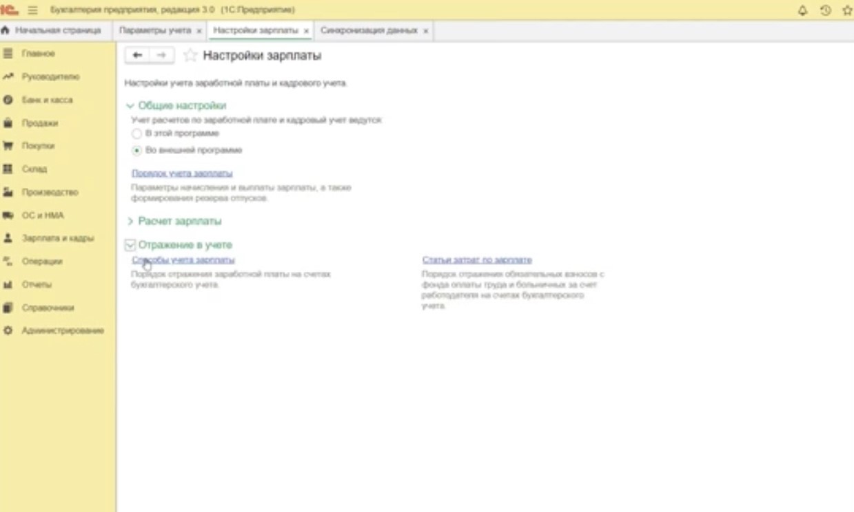 В открывшемся окне перейдите в категорию «Отражения в учете» и нажмите на ссылку «Способы учета зарплаты» (рис.5).