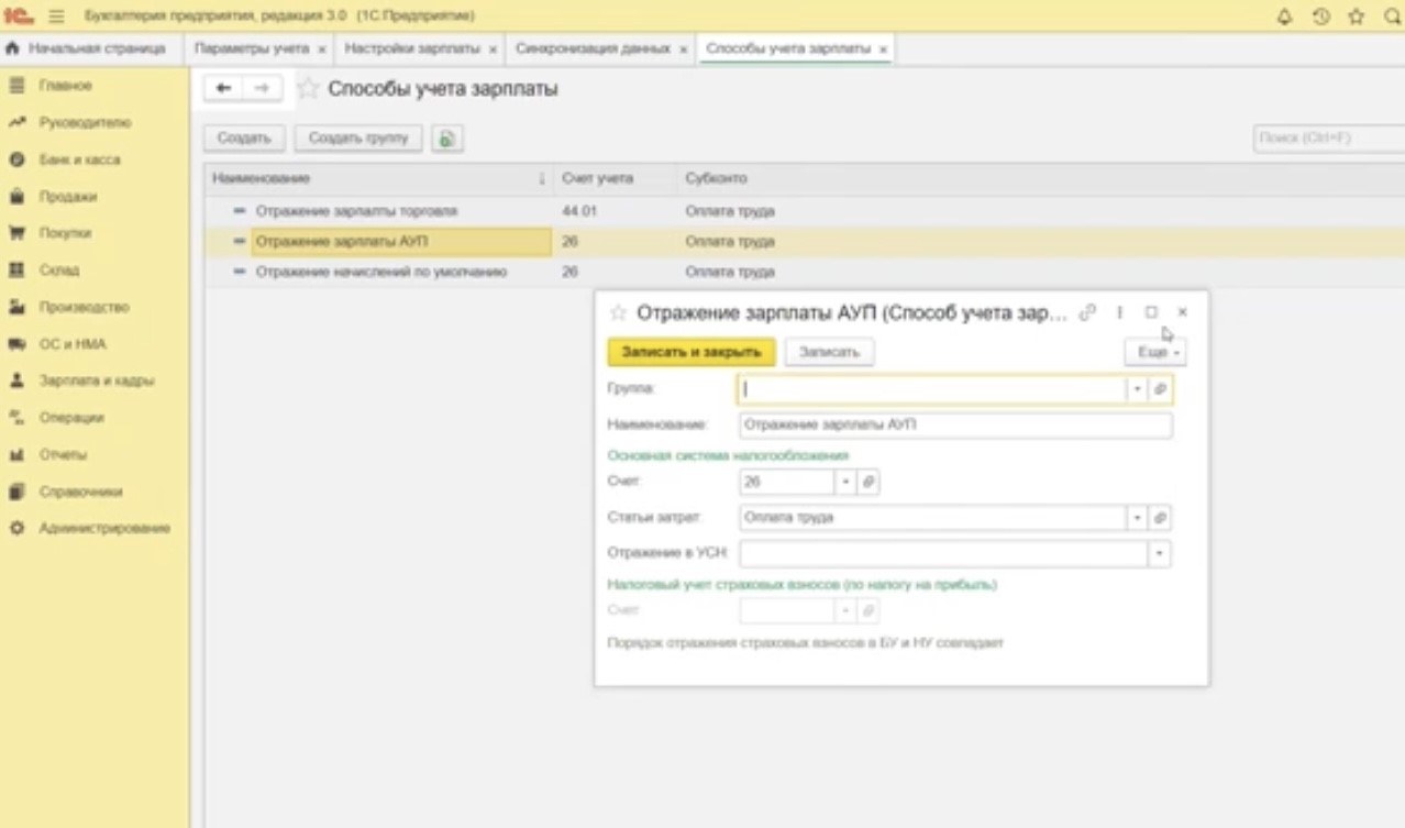 Нажмите «Записать и закрыть», таким образом у вас создастся способ отражения зарплаты в списке. Если применяются другие способы, укажите их точно таким же способом. Обращаем ваше внимание, что названия способов должны совпадать в обеих программах «1С».