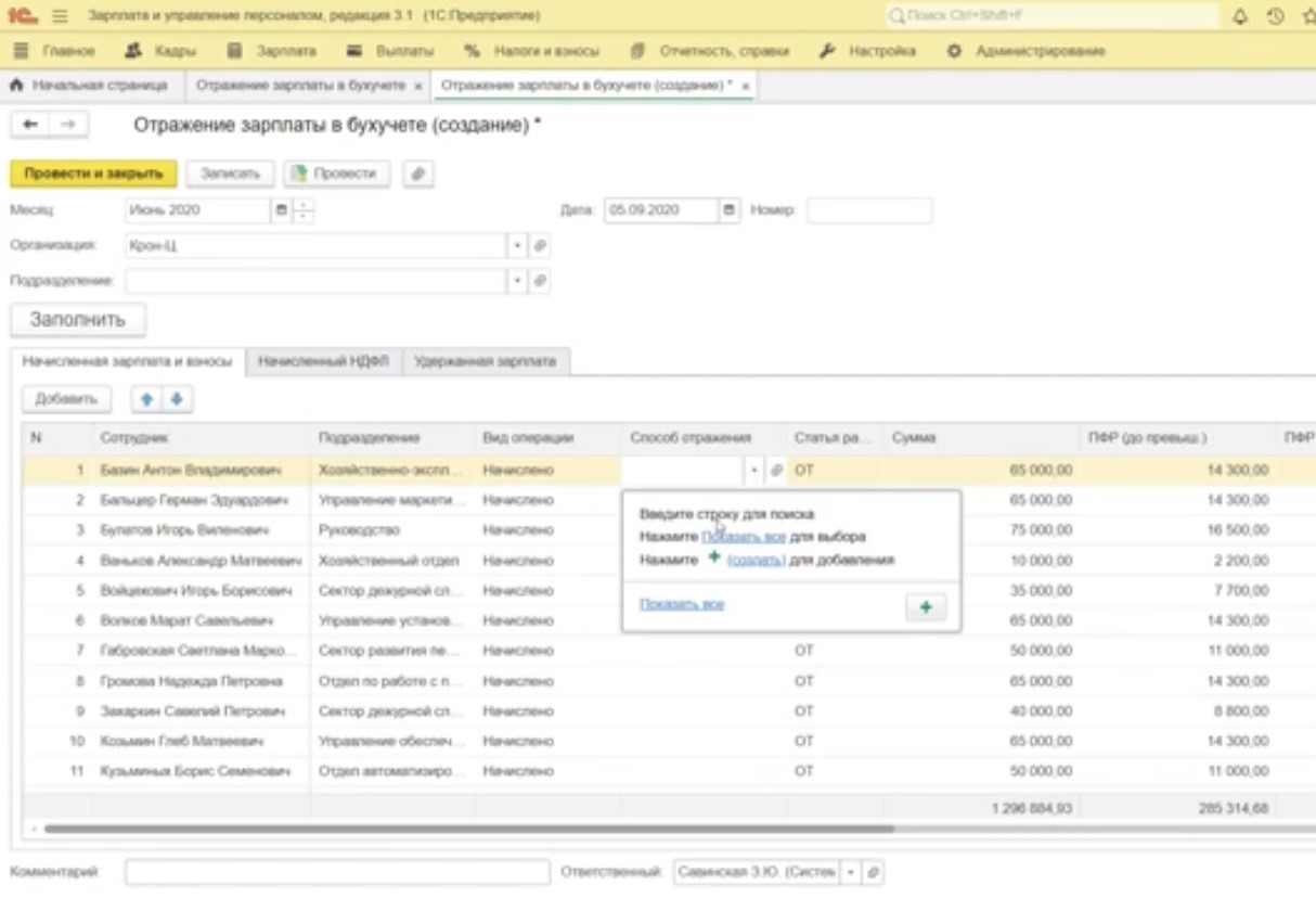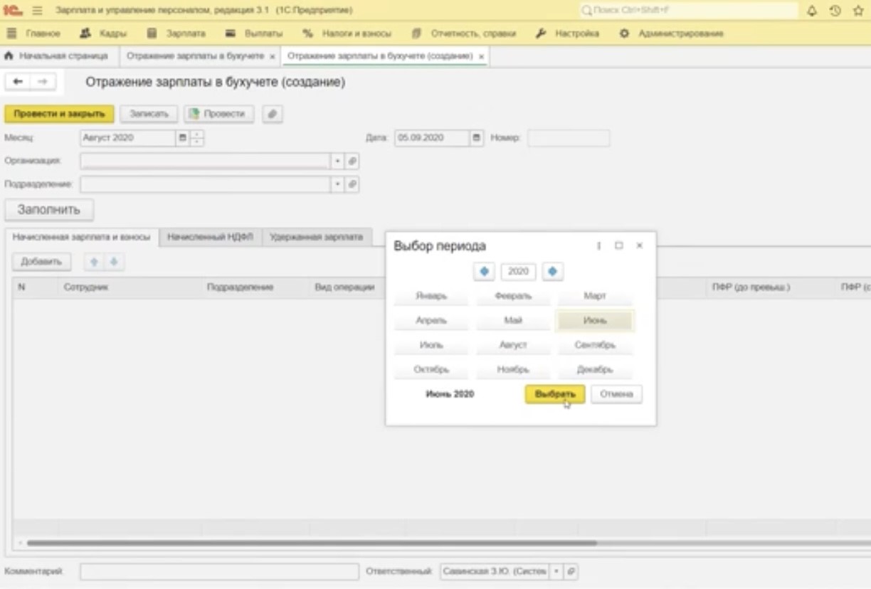 Шаг 6. В «1С:ЗУП» зайдите в меню «Зарплата» – «Отражение зарплаты в бухучете». В этом разделе создаем новый документ, в котором указываем способы отражения зарплаты. Выберите месяц выплаты зарплаты (рис.8).