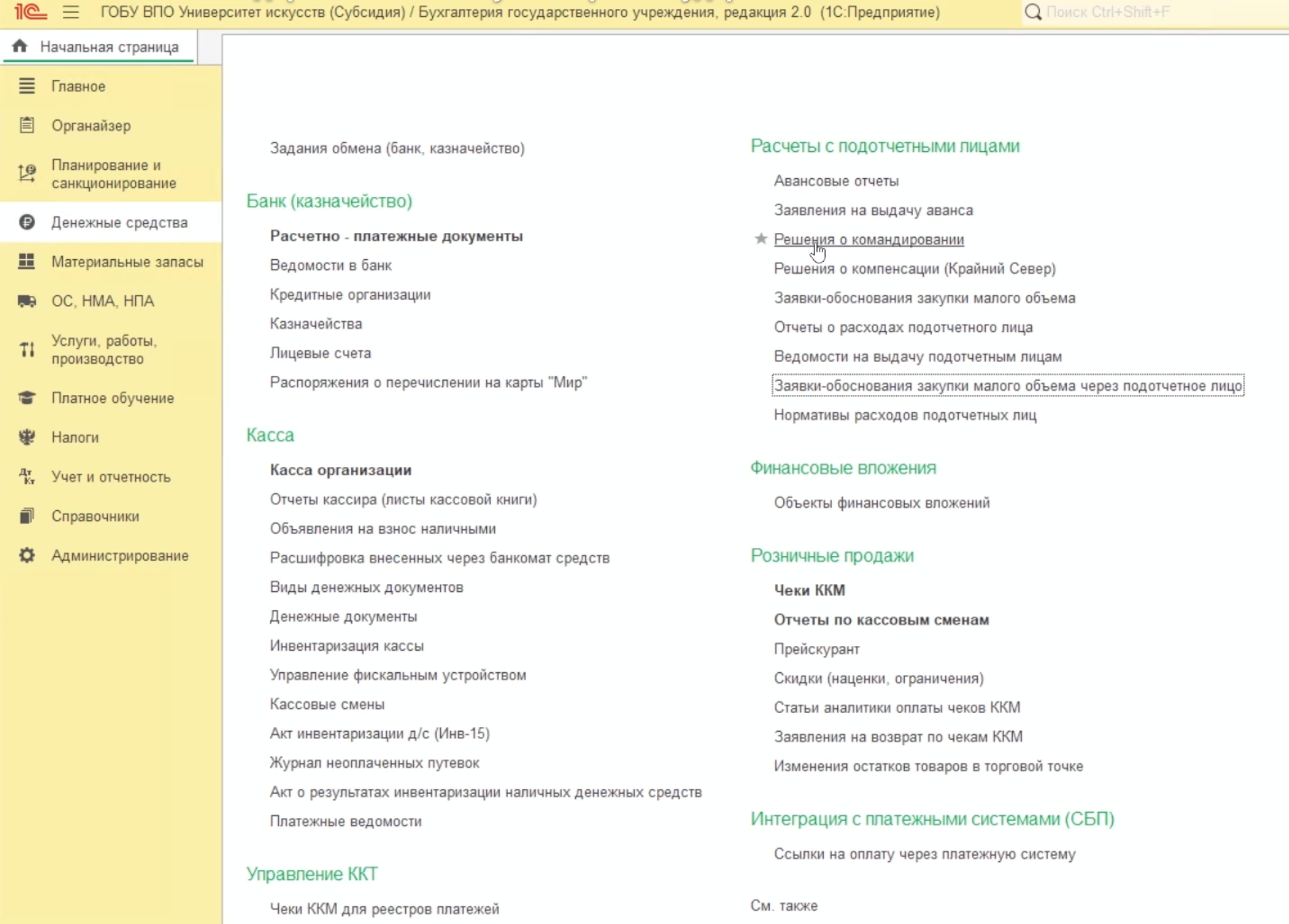 Раздел «Денежные средства» → «Расчеты с подотчетными лицами» → «Решение о командировании» (рис.1).