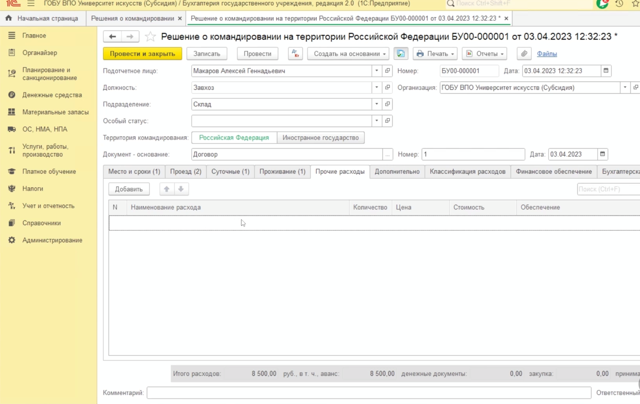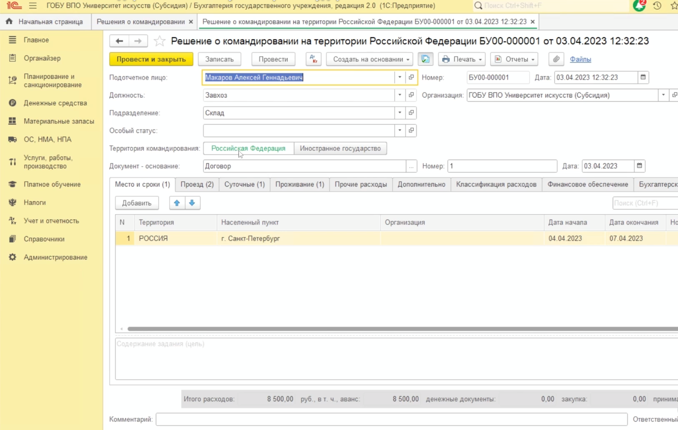 В этой статье разберем все этапы работы с документом «Решение о командировании на территории Российской Федерации» (форма 0504512) в «1С:БГУ» 2.0.
