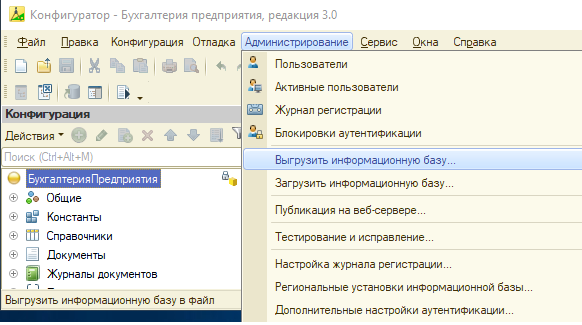 Выберите меню «Администрирование» в режиме предприятия программы (рис.1). Найдите пункт «Выгрузить информационную базу» в списке действий (рис.2). Укажите путь для сохранения файла на локальном диске. Дождитесь завершения процесса выгрузки без прерывания работы системы. Проверьте размер полученного файла на соответствие объему базы.