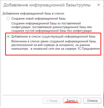 Добавьте базу в список информационных баз в окне запуска. Выберите тип расположения базы «На сервере 1С:Предприятия» внимательно. Введите адрес сервера и имя базы в соответствующие поля. Проверьте соединение кнопкой проверки доступности базы данных сейчас (рис.6,7).