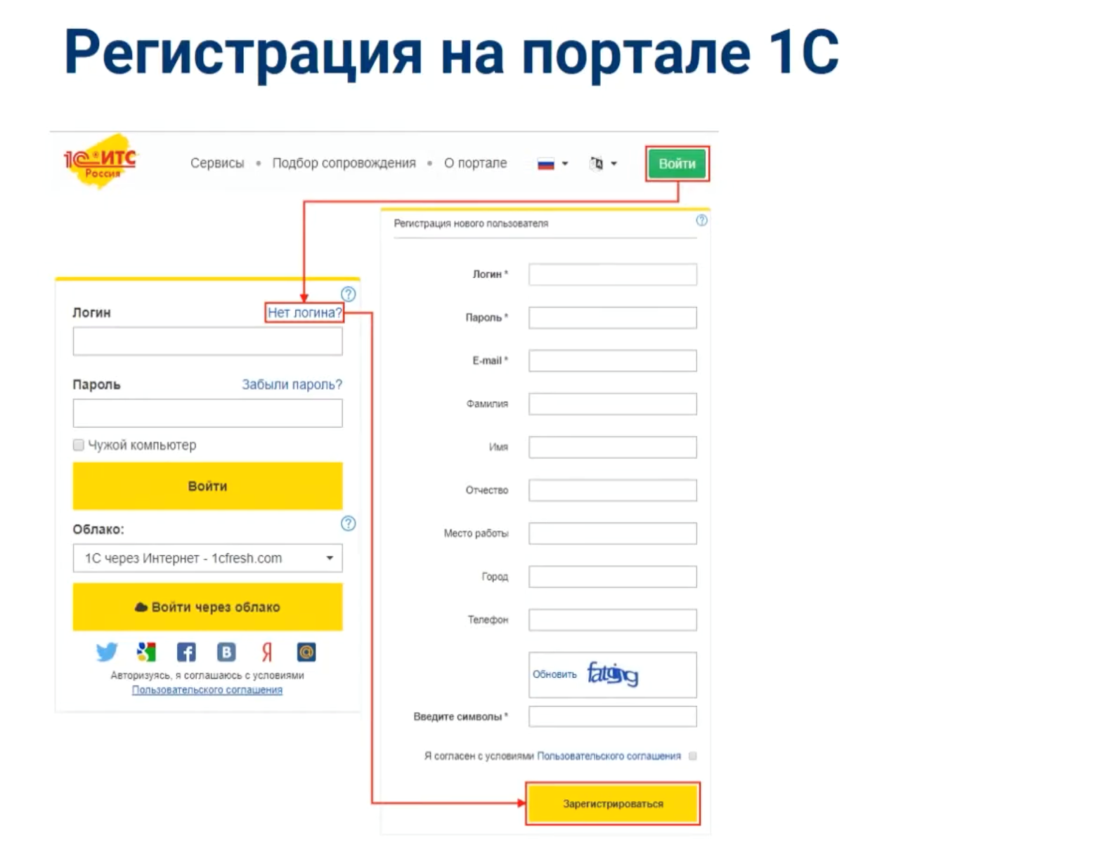 Переход к форме. Зайдите на portal.1c.ru, нажмите «Войти», затем выберите ссылку «Нет логина?» или «Регистрация» (рис.1)